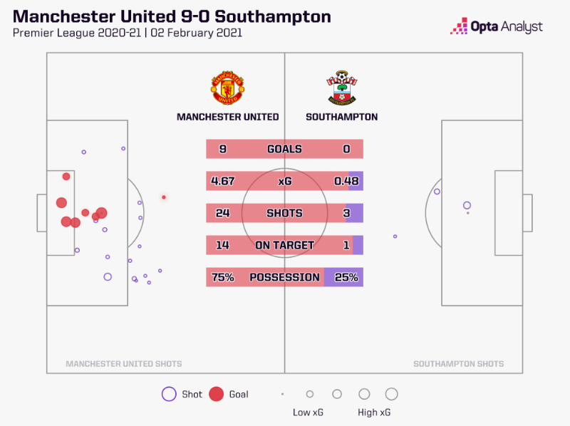 – مانشستر يونايتد 9-0 ساوثهامبتون – 2 فبراير 2021