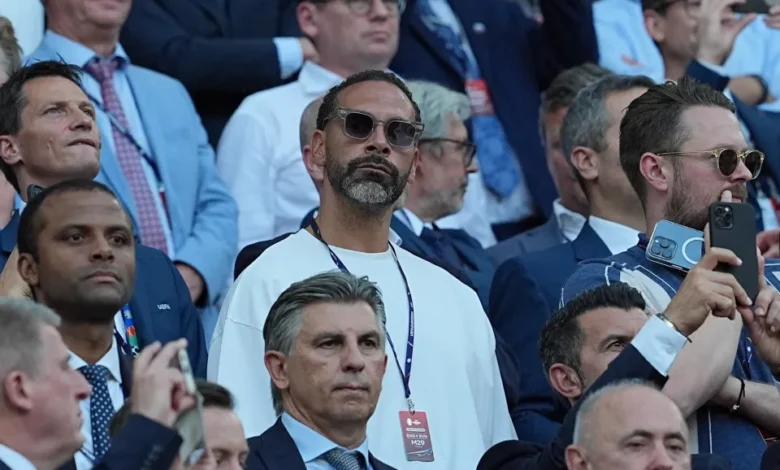 شوهد ريو فرديناند أسطورة مانشستر يونايتد السابقة، وهو يحتسي البيرة مع مشجعي إنجلترا المشاغبين بينما يهتف لثلاثة أسود ضد سلوفاكيا في يورو 2024.