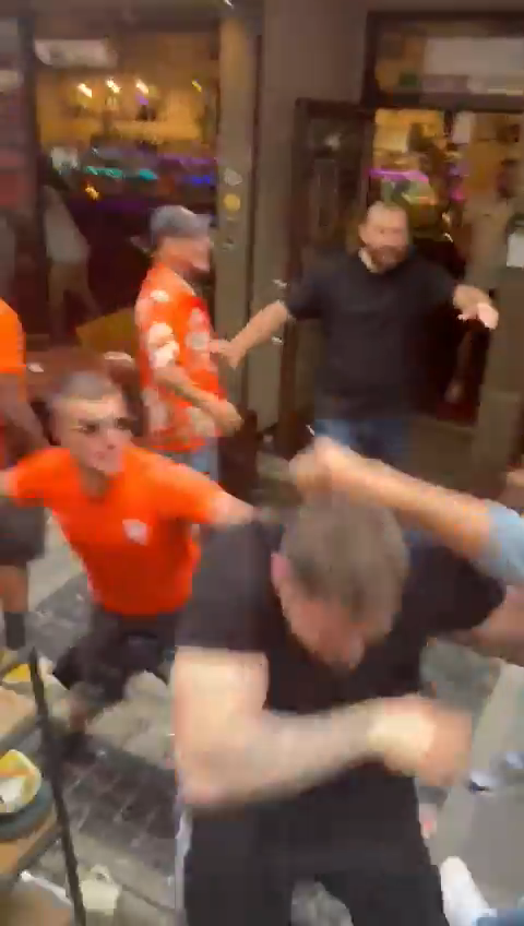 لحظة صادمة لهجوم مشجعي إنجلترا على مشجعي هولندا الذين يلقون باللكمات والزجاجات قبل نصف نهائي اليورو، وشهدت المشاجرة تراجع مشجعي فريق “ثري ليونز” إلى داخل أحد الحانات لتجنب رشقهم بالزجاج.