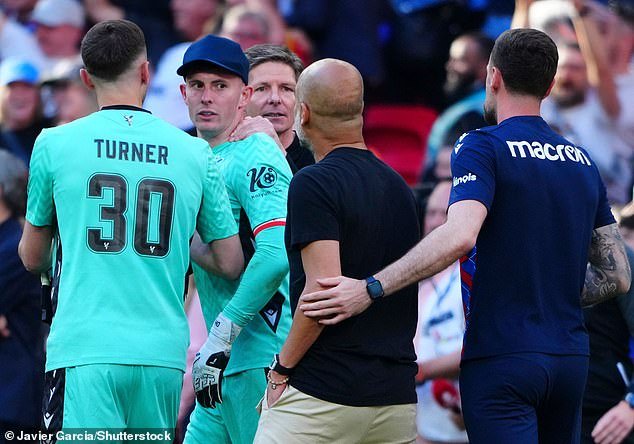 تدخل الحارس البديل لمصلحة كريستال بالاس، مات تورنر، ليبعد جوارديولا عن زميله، فيما بدا أن المدرب الإسباني لا يزال في حالة غضب من القرار التحكيمي خلال الشوط الأول.